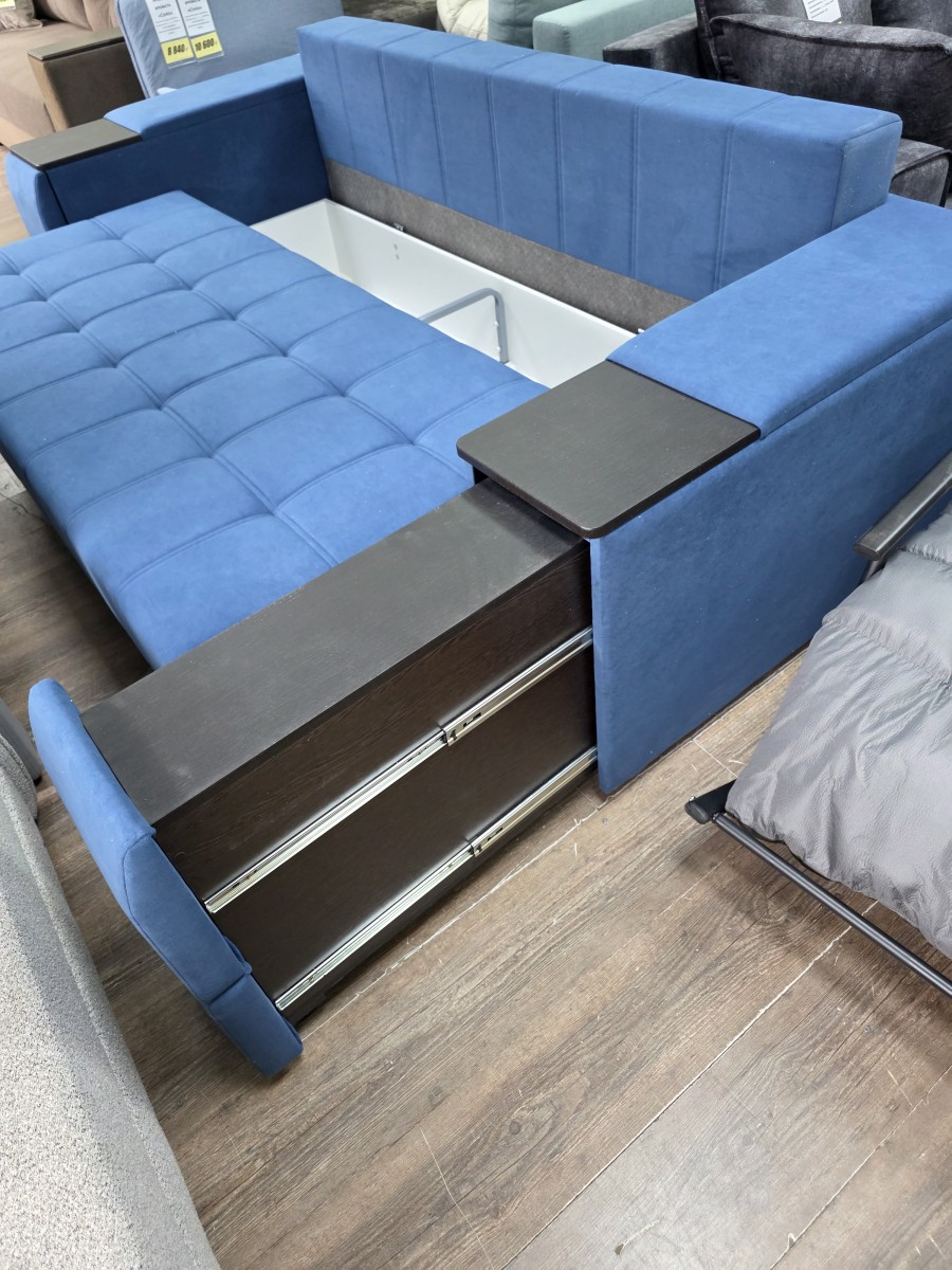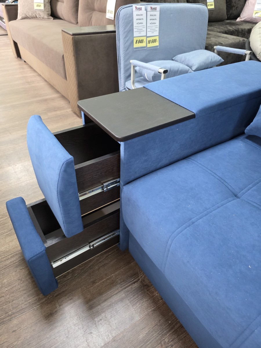 В подлокотниках — вместительные ящики для хранения, а раскладной стол создает дополнительное пространство для мелочей и напитков.